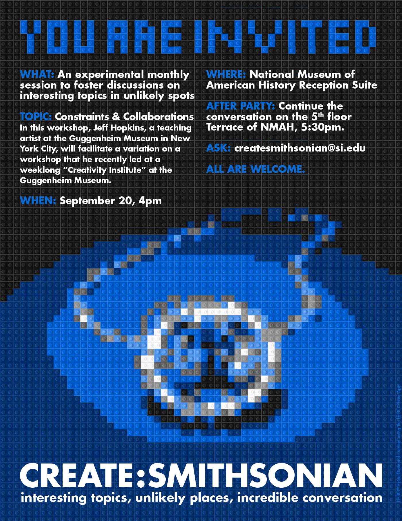 Create:Smithsonian was a three-year Smithsonian staff professional development series conceived and created by a group of employees from across the Institution’s museums, libraries, archives, and the National Zoo, who recently completed the Palmer Leadership Development Program. The events encouraged creativity and relationship building around various themes, under the tagline of “Interesting topics, unlikely places, incredible conversation.”